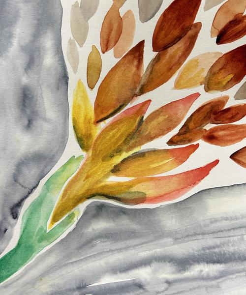 useful to "take it to the art" to see what happens. I (Tamara) wondered what it would be like to explore transition in an art process. I used water because it flows and watercolor paint because it easily shows how the water moves. I started with green and the shape started to look like a hand to me. Out of the hand emerged yellow shapes reminiscent of leaves. As I put the water on the paper, then paint into the water, the color was drawn into the water and moved to fill the wet space. When I put